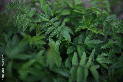 Lush Green Foliage of Healthy Raspberry Bush Leaves in Natural Garden Setting