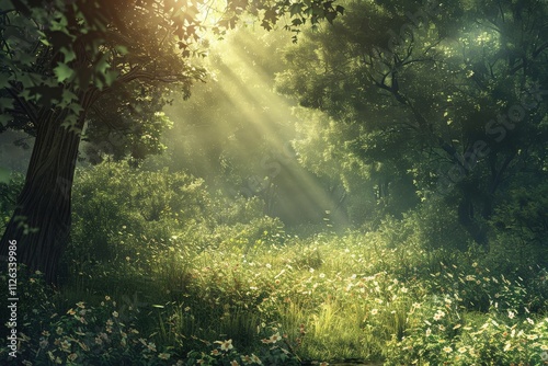 Lush green forest bathed in sunlight with thick trees and vibrant foliage creating a serene natural environment