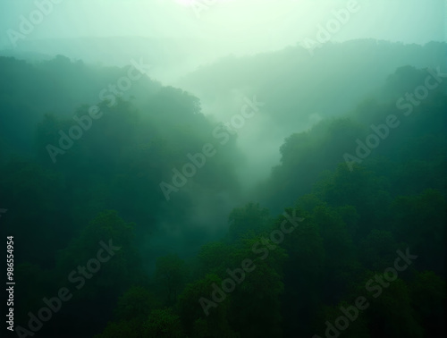 Lush green forest blanketed in dense mist, ethereal atmosphere. Treetops emerge from the fog, revealing a hidden valley. Mysterious and serene landscape bathed in soft diffused light.