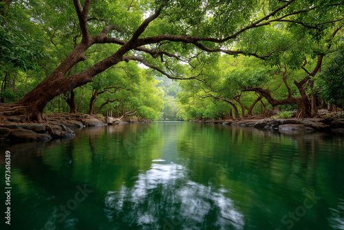 Lush green forest canopy overhangs a tranquil river, reflecting the vibrant scenery