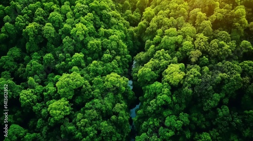 Lush green forest canopy. Sunlight filters through dense trees
