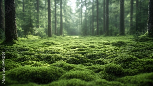Lush green forest floor covered in soft moss and trees.