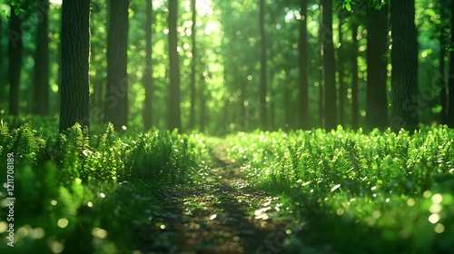 Lush Green Forest Pathway Surrounded by Vibrant Ferns and Trees
