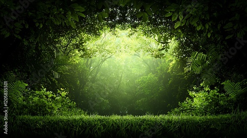 Lush Green Forest Scene with Sunlight Filtering Through Dense Foliage, Evoking Serenity