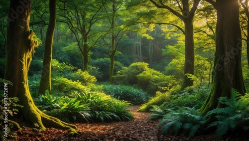 Lush green forest scene with sunlight filtering through trees and dense foliage. Nature, woodland, and greenery. The concept of tranquility and outdoor exploration