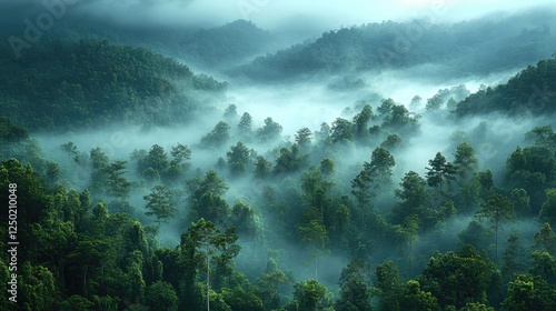 Lush green forest shrouded in mist, showcasing diverse trees and serene landscape in dawn light