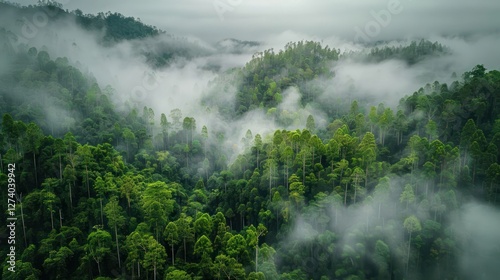 Lush green forest shrouded in mist, showcasing nature's tranquility and beauty.