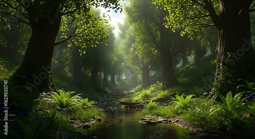 Lush green forest with a stream and sun rays filtering through the trees, a tranquil and serene