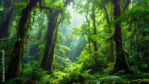 Lush green forest with dense vegetation and sunlight streaming through the canopy