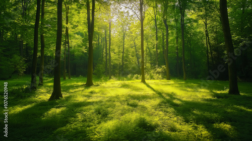 Lush green forest with sunlight streaming through the trees casting soft shadows on the forest floor, creating a serene atmosphere