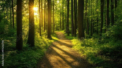 Lush green forest with tall trees dappled sunlight and a winding path