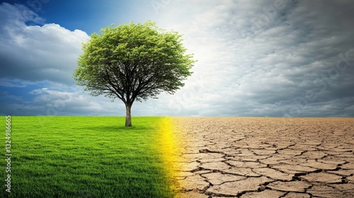 Lush green grass abruptly ends where dry cracked earth begins, with a lone tree standing on the border symbolizing resilience and hope amidst changing environments