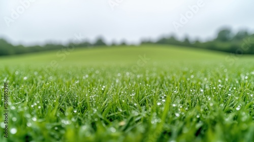 Lush green grass, covered in morning dew, dominates the foreground. A gently sloping hill and distant trees form a blurred background. The image features natural lighting, creating a serene mood. It