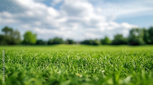 Lush green grass under vibrant blue sky for springtime freshness and natural outdoor scenery : Generative AI
