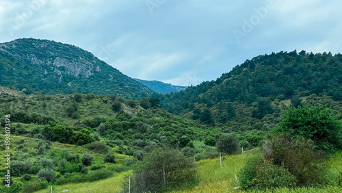 Lush green hills and forests under moody cloudy sky in Turkey , tranquil mountain landscape with rich vegetation and dramatic atmosphere