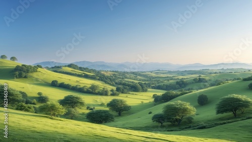 Lush green hills and trees in rolling landscape during daytime with clear sky