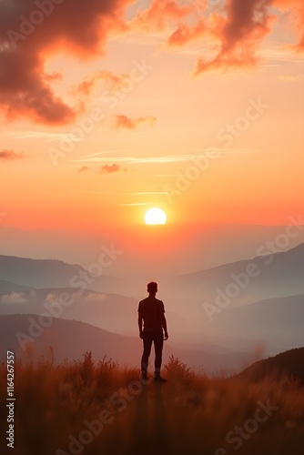 Lush green hills at dawn with person in a golden glow radiating serenity and hope.