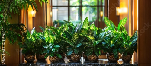 Lush green indoor plants arranged in decorative pots along a glossy countertop with natural light filtering through windows Copy Space