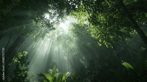 Lush Green Jungle Habitat with Sunlight Filtering Through Canopy Creating a Mystical Atmosphere Surrounded by Vibrant Flora and Fauna in Nature