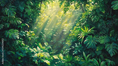 Lush green jungle scene with sunlight filtering through dense foliage, creating a serene atmosphere