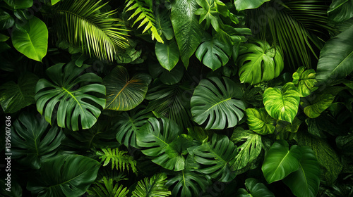 Lush green jungle with many different types of leaves and plants