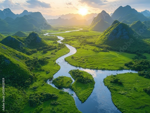Lush Green Landscape Featuring Winding River Through Mountainous Terrain at Sunrise with Golden Sunlight Illuminating Scenic Views
