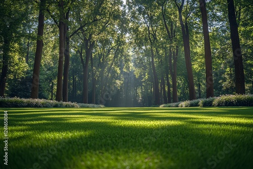 Lush Green Lawn with Neat Stripes and Surrounding Trees and Flowers. Perfectly Manicured Garden Expanse Creating Comfortable Natural Feel.