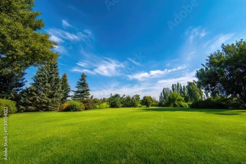 Lush Green Lawn with Towering Trees and Wispy Clouds under Azure Sky