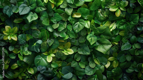 Lush green leaves create vibrant and serene backdrop, showcasing various shades and textures of foliage.