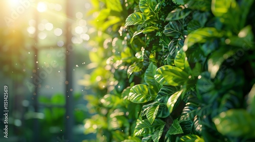 Lush green leaves illuminated by sunlight, creating a serene and refreshing atmosphere.