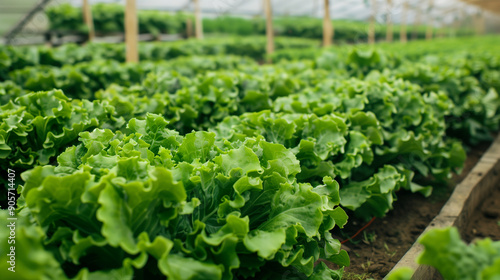 Lush green lettuce growing in well-organized rows in a greenhouse, ideal for promoting healthy eating and organic farming.