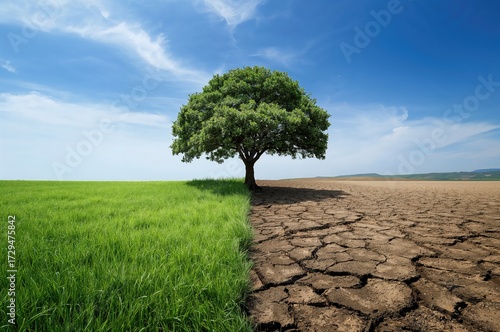 Lush green meadow beside barren dry land showcasing climate change effects, innovative environmental message