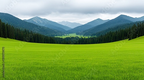 Lush green meadow nestled in a valley between majestic mountains under a cloudy sky.