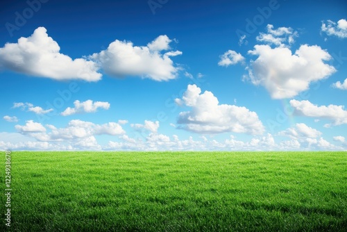 Lush Green Meadow Under Bright Blue Sky With Fluffy White Clouds on a Sunny Day