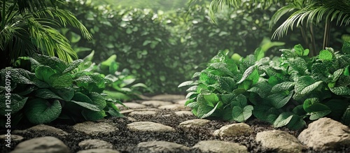 Lush green mint plants framed by smooth stones in a vibrant garden pathway with soft sunlight filtering through rich foliage creating a serene ambiance