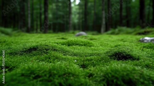 Lush green moss carpet in a forest. Close-up view of a thick moss layer covering the forest floor, with blurred trees in the background