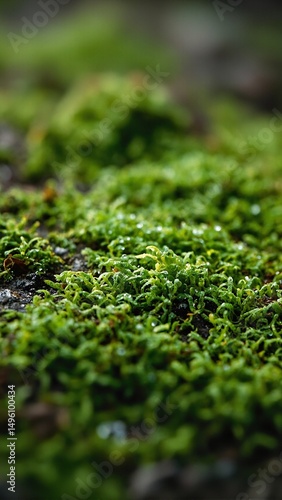 Lush green moss covering a rocky terrain with intricate textures and droplets of dew glistening in the light