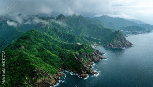 Lush green mountains meet a dramatic coastline