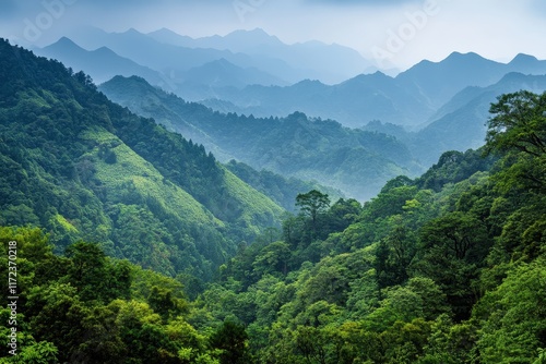 Lush Green Mountains Under a Cloudy Sky With Layers of Blue-Hued Peaks in the Distance