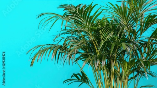 Lush green palm plant against vibrant blue background. Perfect for summer, tropical themes, or home decor