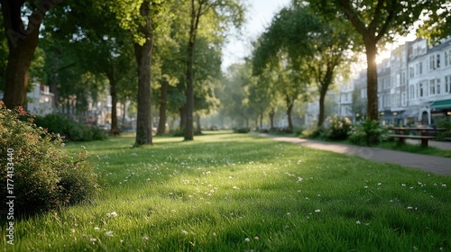 Lush Green Park Pathway Bathed in Golden Sunlight With Mature Trees Lining the Path and Buildings in the Background during Daytime