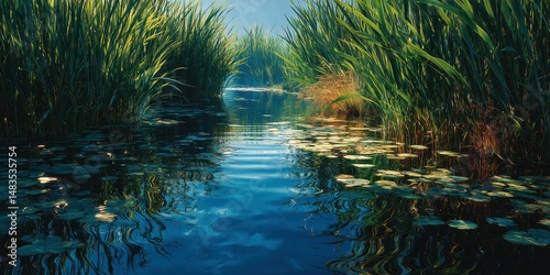 Lush green reeds and tranquil waters reflect sunlight in a serene wetland landscape at dawn