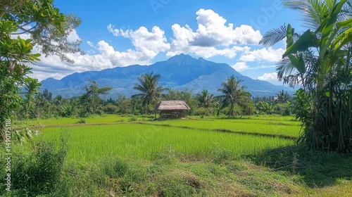 Lush green rice paddy field with a small hut, under a vibrant blue sky and majestic mountain backdrop