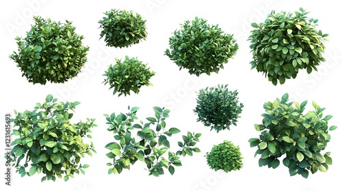 Lush green shrubs, garden plants, top view, isolated white background, landscaping design