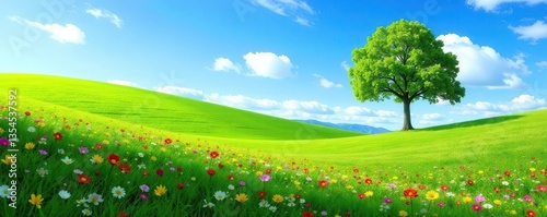 Lush green slopes, riot of colorful blossoms, single tree stands tall under clear blue, flowers, tranquil