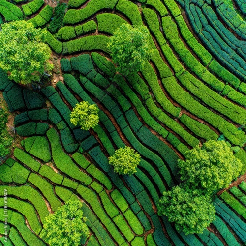 Lush Green Tea Plantations Create Beautiful Patterns in Landscape From Above