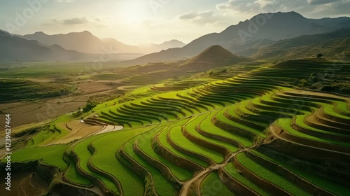 Lush Green Terraced Rice Fields Under a Vibrant Sunlit Sky