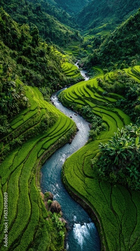 Lush green terraced rice paddies winding around a flowing river