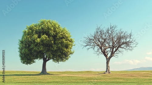 Lush Green Tree and Dead Tree in Field with Blue Sky - Nature Contrast Concept.