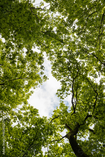 Lush green tree canopy viewed from below, showcasing vibrant leaves and a glimpse of the sky, creating a serene natural atmosphere